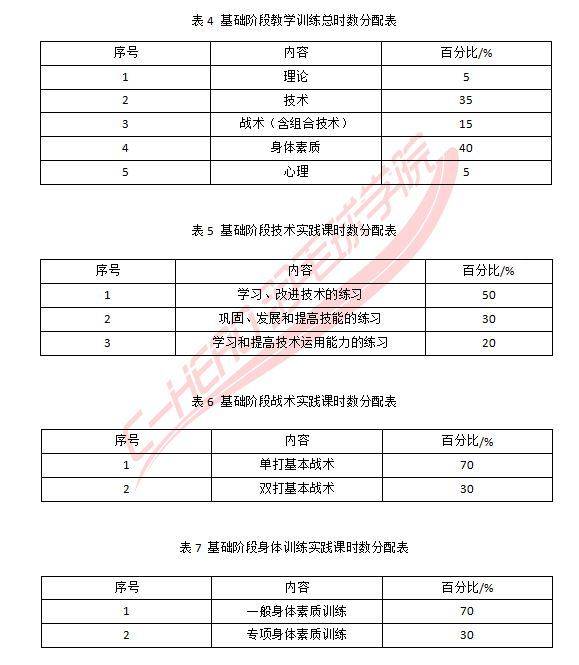 本阶段教学训练年限为3-5年,每周课次5-8次,每次课2小时-2.5小时。具体分配参见表4-7